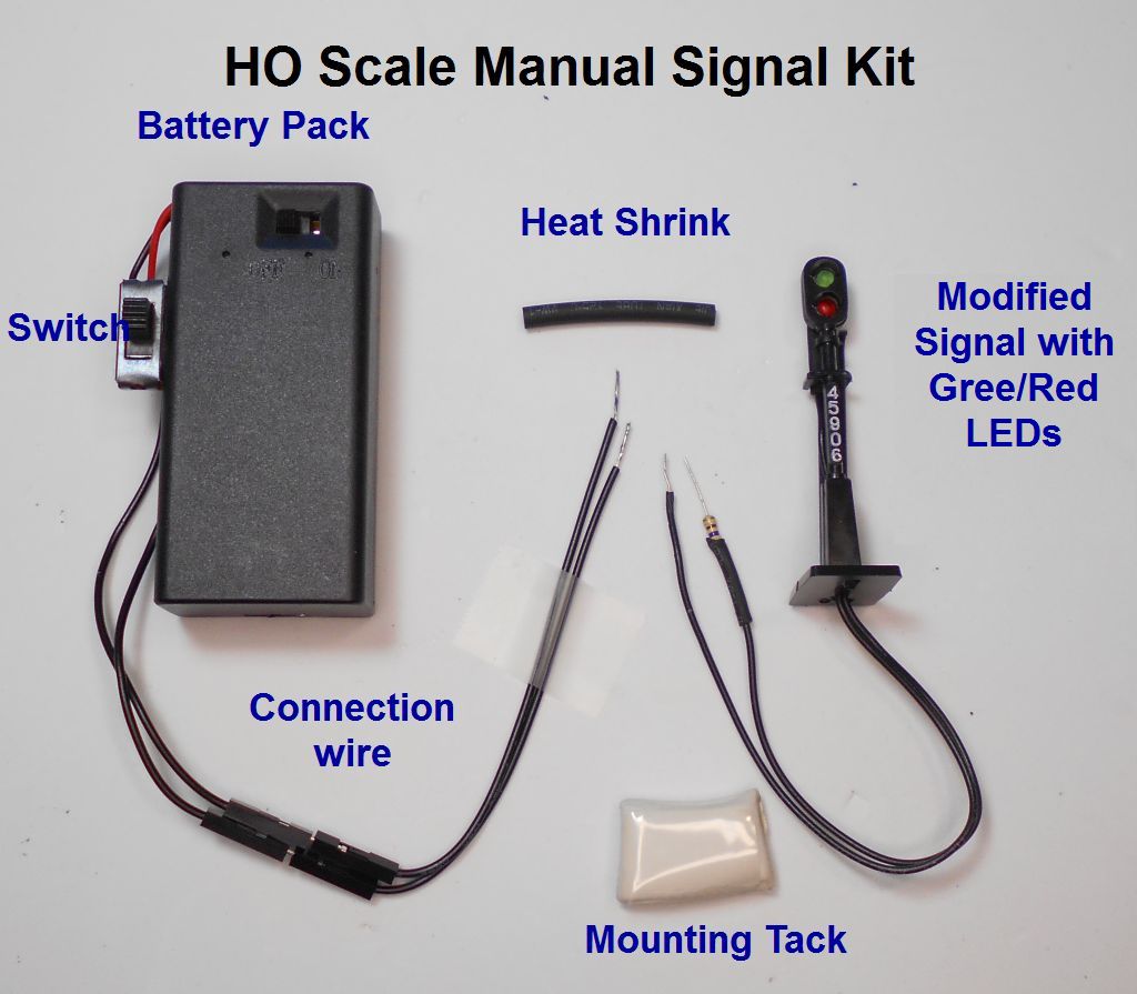 Unmodified HO Scale Signal Kit This kit includes the unmodified signal and electrical components for modifying a HO Scale Bachmann Block Signal. A 620 ohm resistor is included for use with a 9 Volt battery or power supply.This kit is for those who wish to prepare the signal by installing the LEDs and wiring according to the instructions included. Modified HO Scale Signal Kit This Kit includes a modified HO Scale Bachmann signal with LEDs and wiring installed. The aspect is Green over Red. A 620 ohm resistor is included for use with a 9 Volt battery or power supply (not included). For operating signals see Project 12b and 12c below.