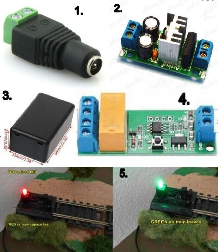 | Project 16 - Accessories 1.DC Adapter for using a 6-12 V DC power Unit 2. 12-20 Volt AC to 9 Volt DC Power Converter 3. Black Project Box to house Relay Board 4. Replacement Auto Reversing Relay Module 5. Set of 2 LED Lighted Modified HO Scale Atlas Bumpers with Red/Green bidirectional LED and custom wiring |
