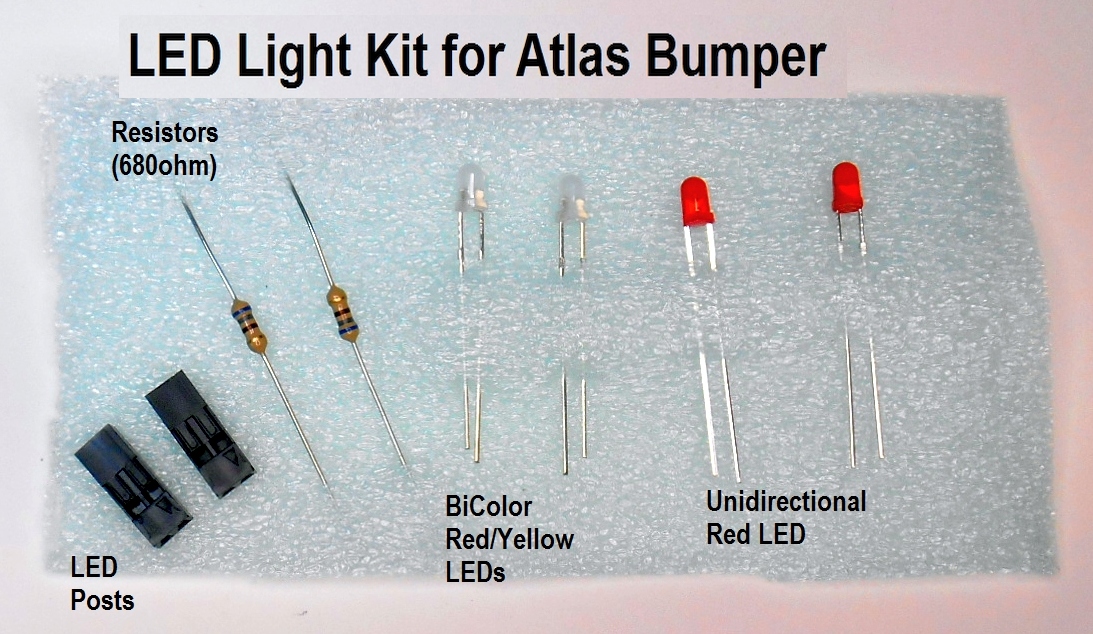 This kit includes the components for installing an LED circuit into either an Atlas (#843) HO scale end of track Bumper. The kit can be used for 2 Bumpers available at Hobby shops or online. Lighting options include a static unidirectional Red LED or Bicolor Red/Yellow LED. Only the latter will light when current direction is changed. Instructions are included. Soldering of some components is required.
