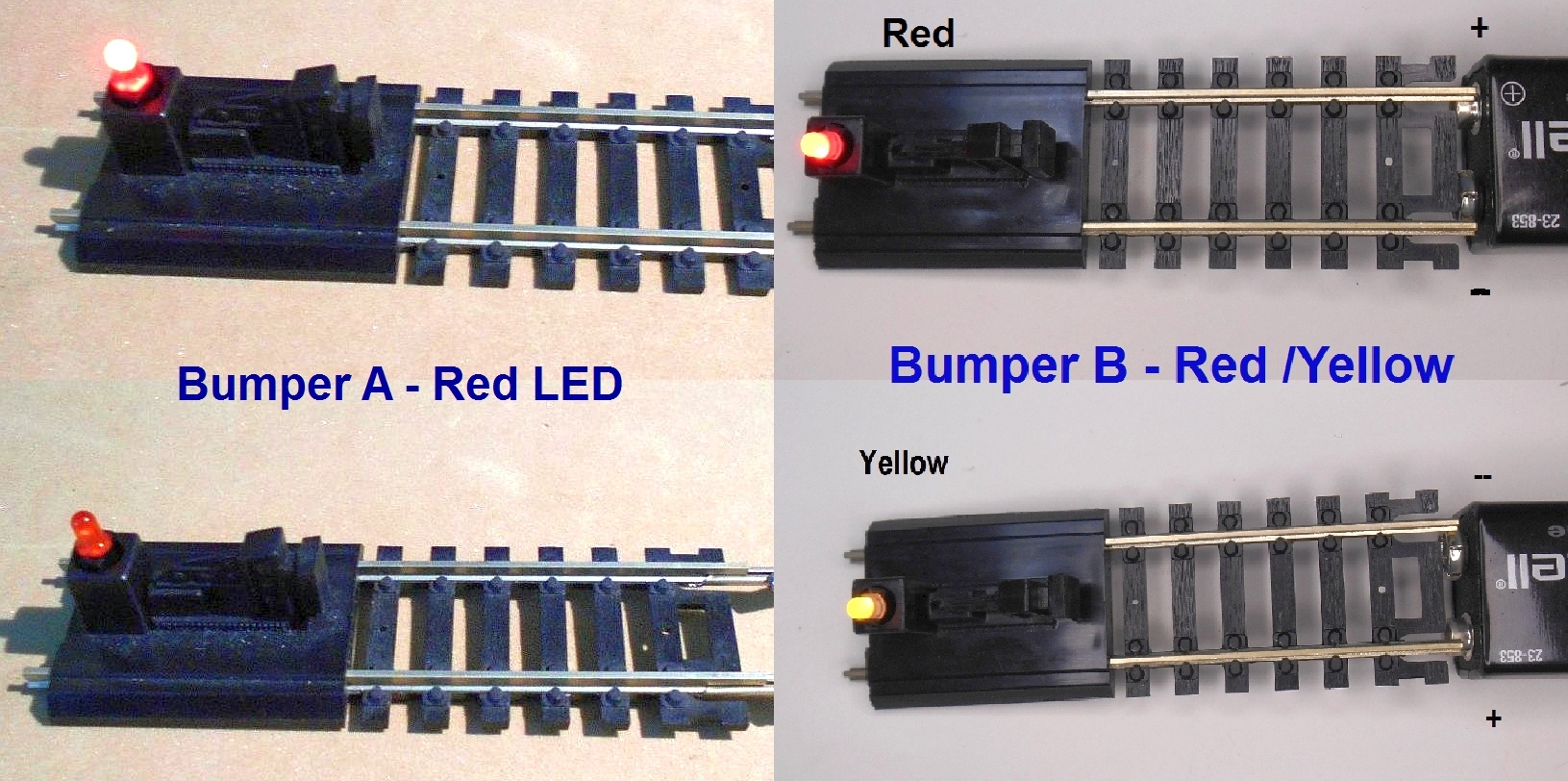 Bumper with LED installed. This is a new Atlas (#843) HO scale Bumper prepared with an LED installed . The track is Code 100 nickel silver track. Two options are available.* A. Atlas Bumper with unidirectional Red LED. (Lights Red only when train approaches the bumper. B. Atlas Bumper with a bidirectional Red/Yellow LED (Red Lights as train approaches and Yellow as it leaves) * 1)Track must be wired to NMRA standards. 2) Lights in DC mode. In DCC mode A lights in Red in both directions and mixed color with B. 3) These will not work with the Auto-Reversing system (see Project 16 - Accessories 5) |