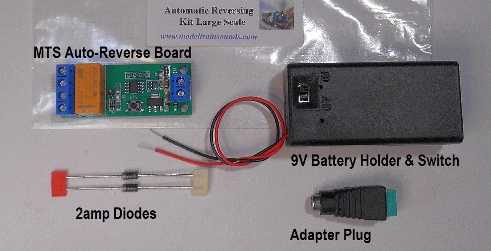 includes * The MTS auto-reversing timed DPDT Relay Board used to change the direction of current flow after preset set time. * A 9 Volt Battery holder for powering the Board * An adapter plug for use of a wall transformer 9-12VDC to power the board instead of using the battery. * Two 2 amp diodes to control the stopping of the loco. Full instructions for installation. |