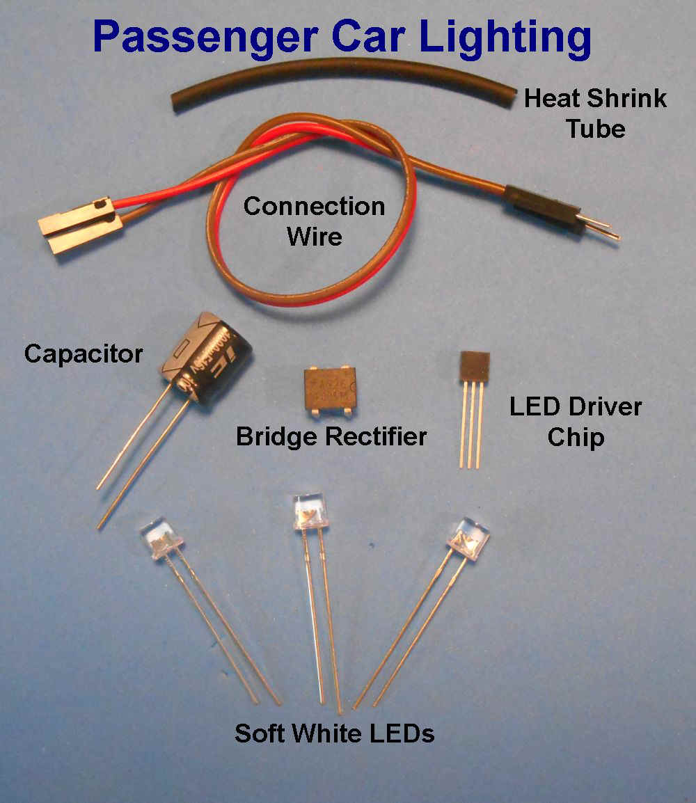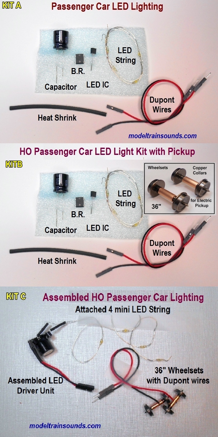 for using existing Track electrical pickup Three kits are listed 1) Kit A. For Passenger cars with a method for electric pickup installed. The components include a String of mini LEDs. along with electrical components and complete instructions. Soldering is required. 2) Kit B. This kit is the same as Kit A but includes 2 wheel 36" sets with copper collars for track pickup of electrical current. Soldering is required. (If 33" wheels are required sent a note when ordering)