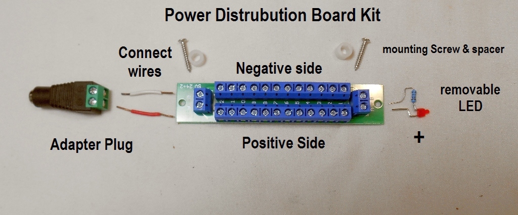 Project 21 Power Distribution Board for powering accessories KIT A (13 Terminals) This kit includes 1. A power distribution board with 1 input and 13 output terminals 2. A 2.1x5.5mm adapter plug and wires for use with a standard 110 VAC transformer with out put from 5-12 Volts. 3. An ON/OFF LED indicator, optional for port 13 4.Screws and collars for attachment to a console. 5 Adapter plug for adding DC wall transformer KIT B (6 TERMINALS) 1. A power Distribution Hub with 1 input and 6 outputs 2. Push button inputs (no screw for wires ) 3 . Adapter plug for adding DC wall transformer