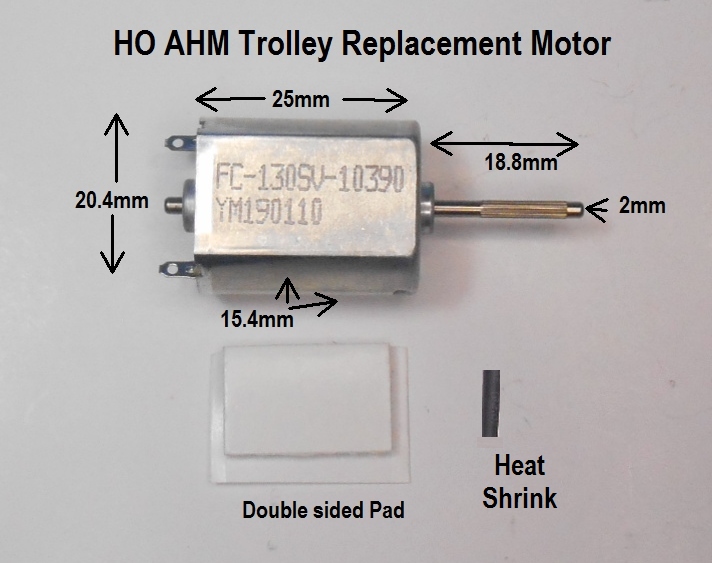 Project 20 B AHM Trolley Lighting Kit This kit includes 2 Yellow LEDs ,a 1K Resistor and heat shrink tubing along with instructions. AHM Trolley Motor Replacement This motor can be used to replace a non working original motor of these trolleys. The motor is brushless, quiet and smooth running. The old motor worm screw is reinserted onto the drive shaft of this motor.